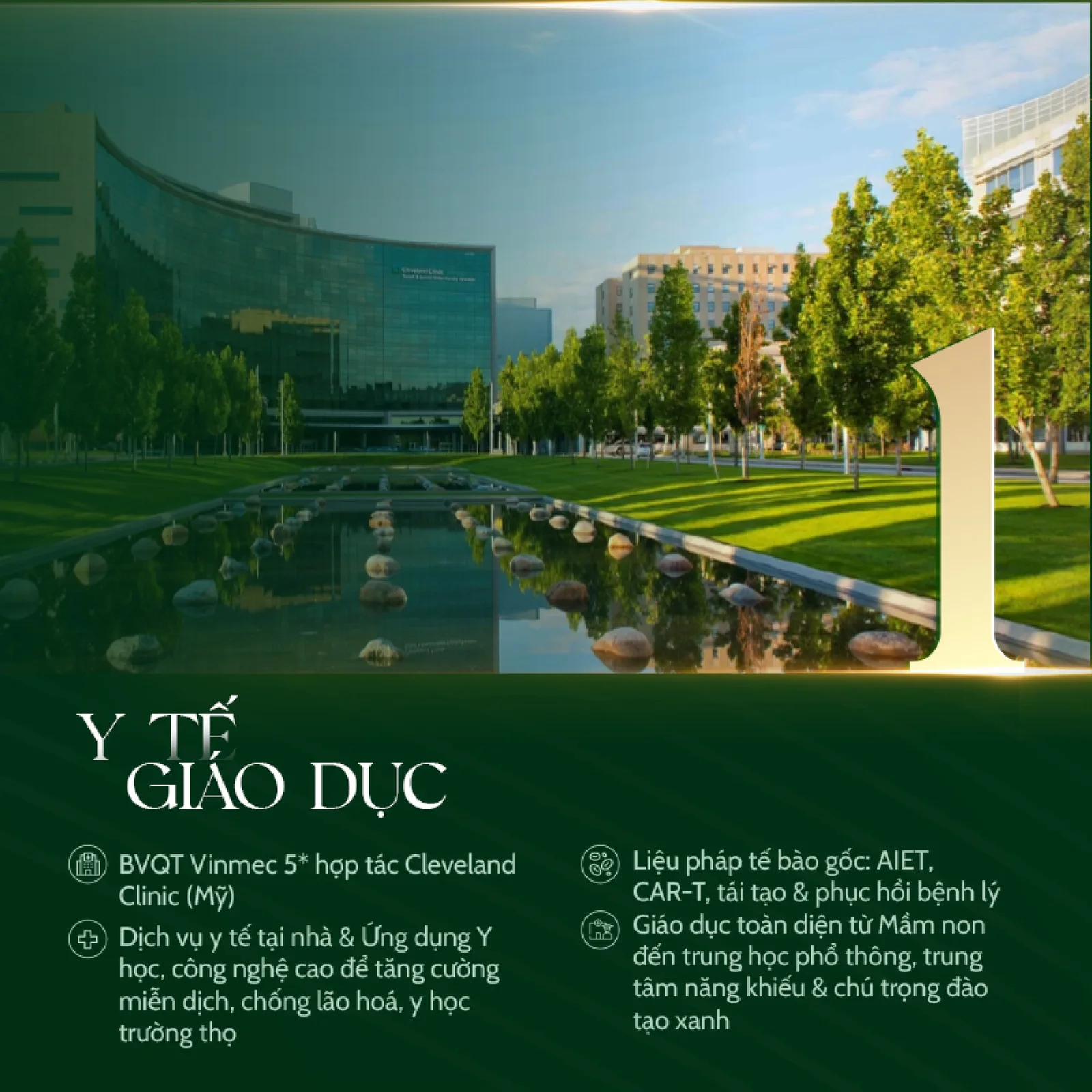 - Y tế: Bệnh viện quốc tế Vinmec 5★ hợp tác Cleveland Clinic (Mỹ) – tiên phong y học cá thể hóa, chăm sóc sức khỏe toàn diện cho cư dân.