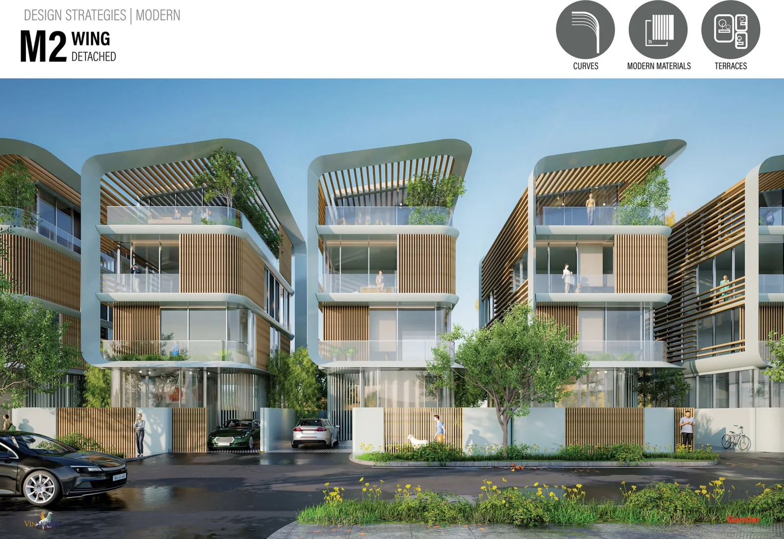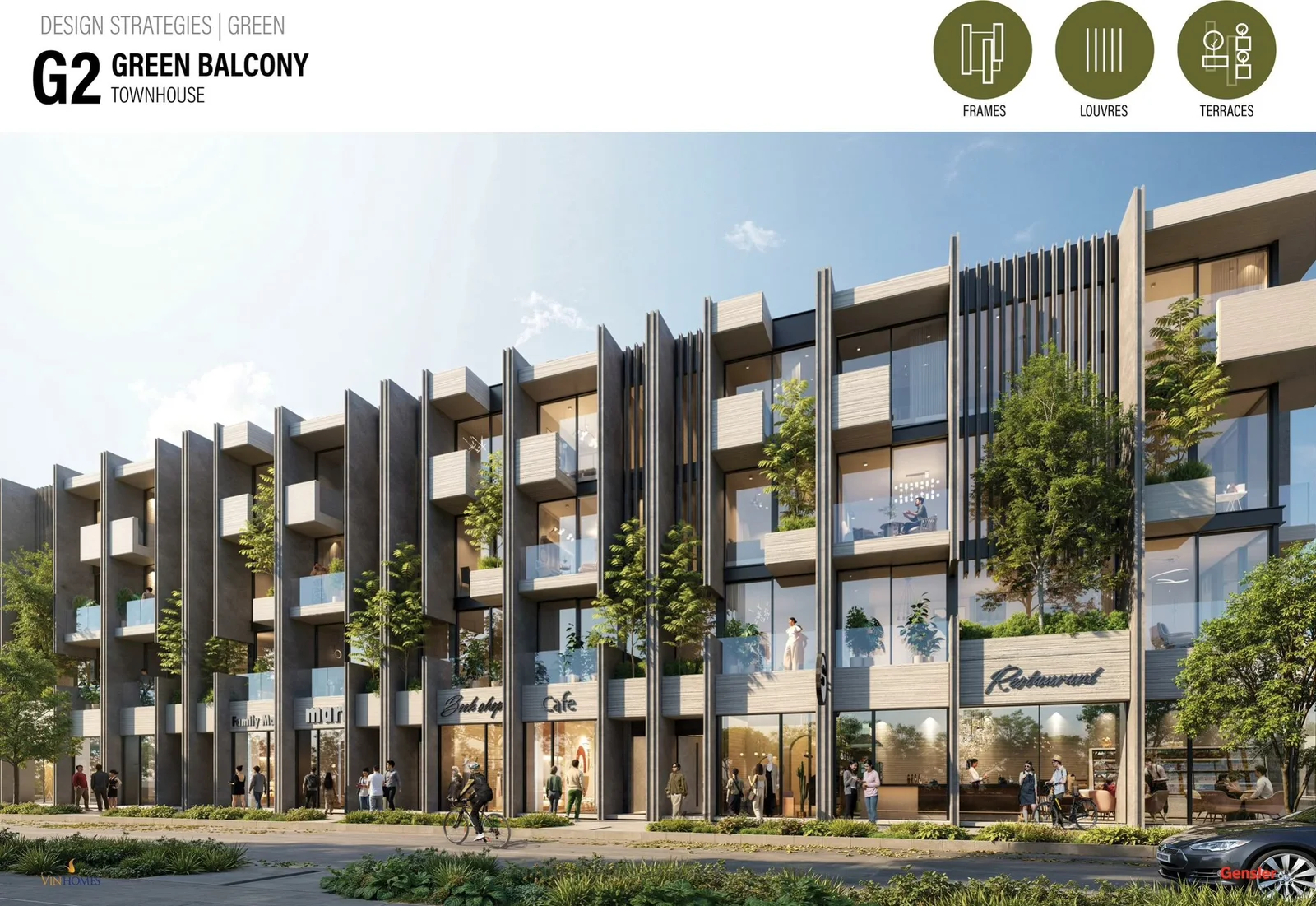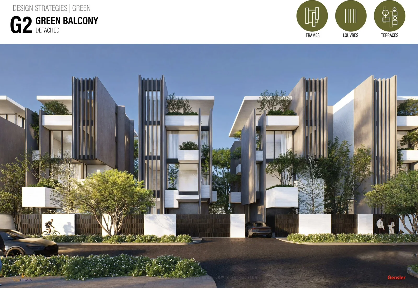 Mỗi căn nhà được phủ kín bởi mảng xanh liên hoàn, từ mái nhà, ban công, tường đứng đến lam che nắng. Những khối kiến trúc hiện đại được “mềm hóa” bằng sắc xanh sinh thái, giúp ánh sáng và gió trời luân chuyển tự nhiên, tạo nên vi khí hậu mát lành và kết nối thị giác trọn vẹn với thiên nhiên.